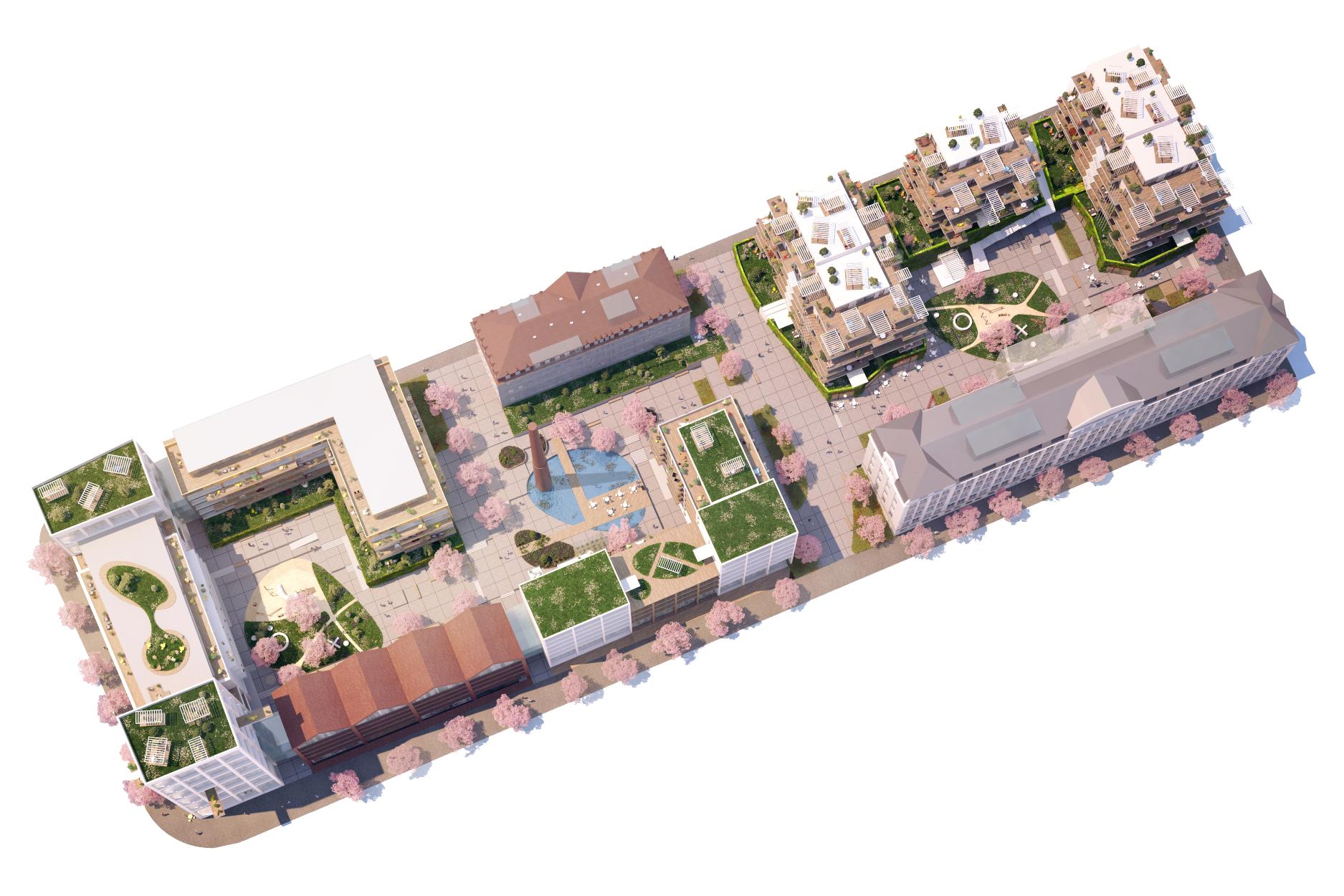 Řešené území se nachází v Praze 10 – Vršovicích na hranici kompaktní městské blokové zástavby a rozvolněné modernistické struktury. Ze studia místa vyplývá způsob „toku a života“ města v daném území. Základní urbanistické prvky místa: náměstí Svatopluka Čecha, končící bloková zástavba, vršovická radiála. Návrh vytváří dva bloky se třemi vnitřními prostranstvími, které mají za cíl zprostředkovat unikátní atmosféru života v rámci polo-uzavřených městských bloků. Vytváříme polyfunkční prostor, kde kromě bydlení budou zastoupeny kancelářské provozy a plochy retailu. Zajímavými prvky návrhu jsou zejména zachovaný stávající komín a dominantní objem věže v západní částí území.